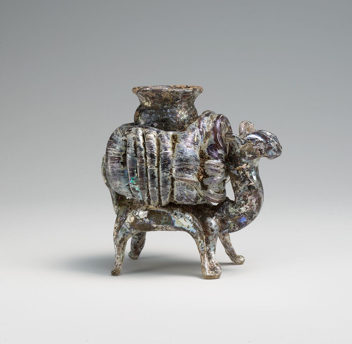 STEFAN HEIDEMANN: You have a little glass jar which is blown, and then the figure is constructed with glass blobs and glass trails, just around it. And these are two early examples of Islamic glassmaking standing in the tradition of Byzantine and Roman glassmaking. The one figure… looks quite weird. It is difficult to discern what does it mean. It is an animal with almost two heads and even four heads are protruding from the glass cage. It is somehow a caravan, put together in one single piece. Both pieces are extraordinary in that they are preserved in such a good state. But you see that both are archeological objects, by the disfiguring of the color of the surface. Originally you must imagine this as a greenish and bluish transparent glass.
