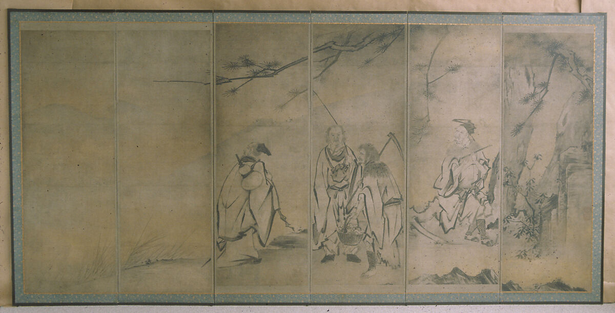 The Chinese Daoist immortals are legendary mountain recluses who attained supernatural powers and longevity by practicing meditation and alchemy. Auspicious personalities, they became a popular subject for screens and sliding-door panels in sixteenth-century Japan. The attributes seen here, such as the flute, the basket of life-extending fungus, and the gourd, suggest that these figures represent four of the Eight Immortals. The remaining four (including the two female immortals) were presumably depicted on the missing mate to this screen.
