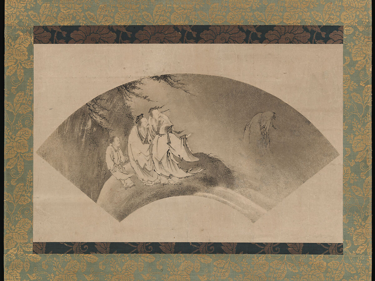 Liezi (Japanese: Resshi) was a legendary Daoist sage who rejected all worldly ties and flew away with the wind. Here, he disappears from the eyes of onlookers into the darkened sky. Fan paintings were a common means by which Kano-school painters shared their knowledge of Chinese styles of the Song and Yuan dynasties. A faint seal links this to Kano Yukinobu, younger brother of the school’s second-generation leader, Motonobu (1477–1559).