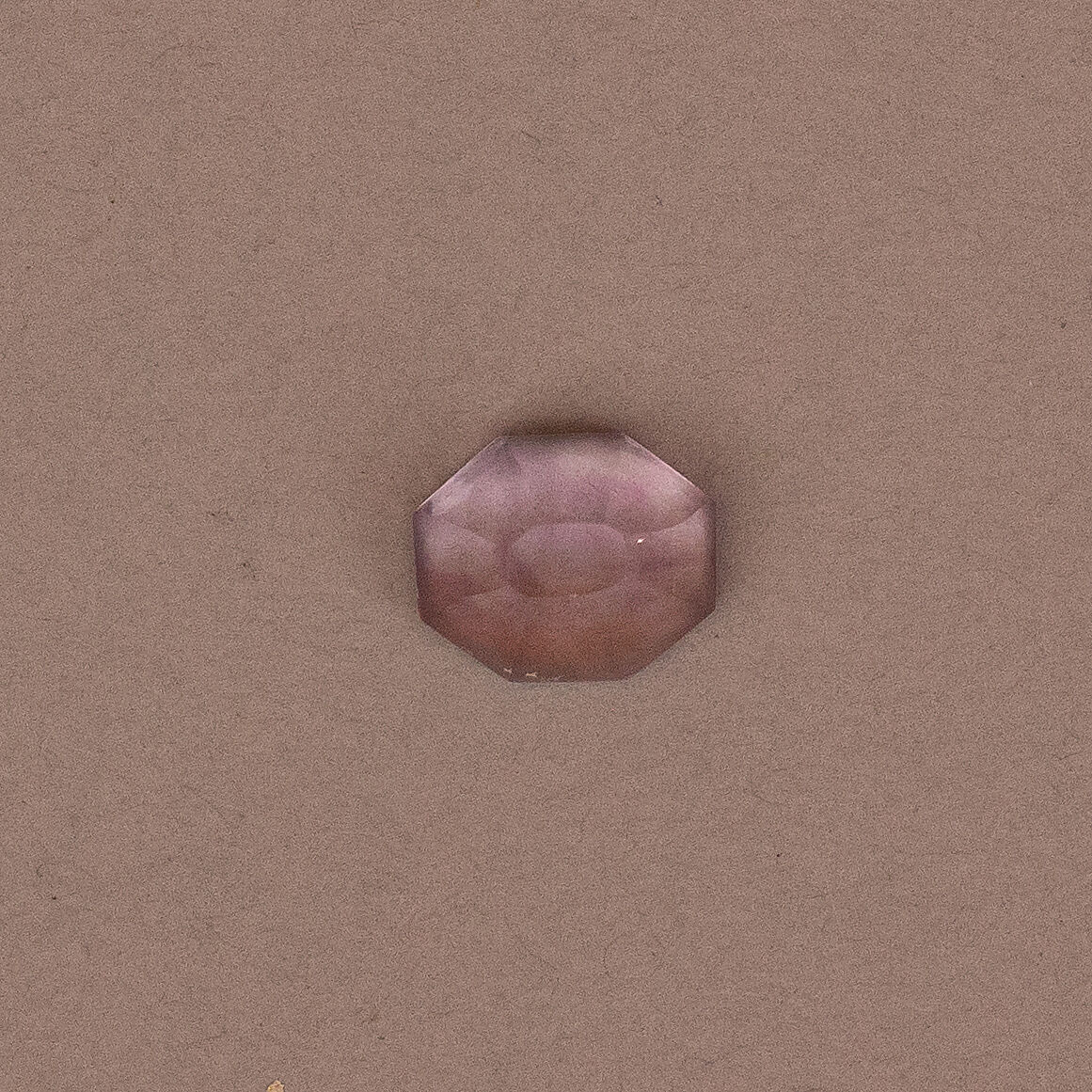 - Medium: Amethyst; cut and polished on rotary flat lap