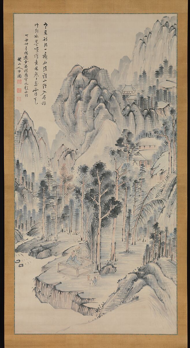 By fancifully reinterpreting this Zen temple near Osaka as a Chinese retreat, Beisanjin cleverly reveals the heart and soul of the site, particularly its cultural heritage. A rice merchant in Osaka known for his love of learning, Beisanjin was an amateur painter whose quick flashes of insight were deeply admired by both his contemporaries and later literati artists. The patterned brushwork and overall energy of the painting surface reveal his study of Yuan-dynasty artists—notably Huang Gongwang (1269–1354)—and their successors.