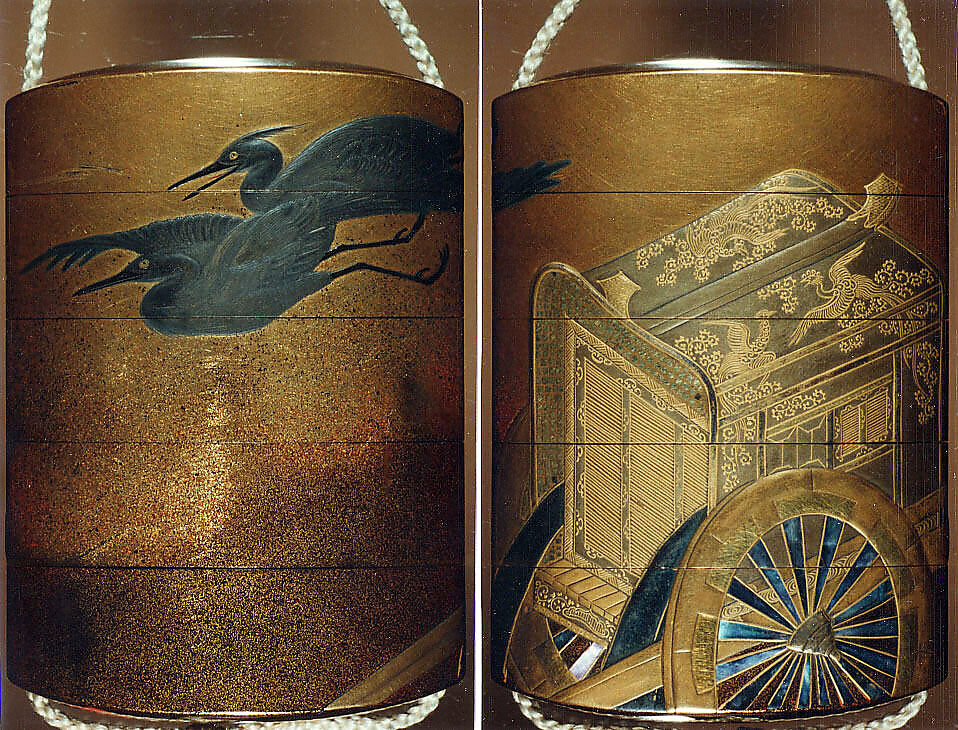 - Title: Case (Inrō) with Design of Imperial Cart and Flying Herons (obverse); Court Carriage and Flying Herons (reverse)