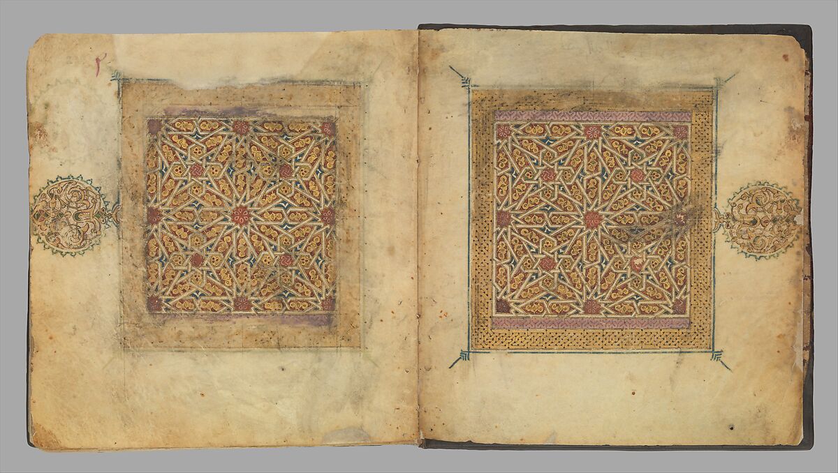 As the second volume of a seven-part Qur'an manuscript, this codex contains no colophon, but it opens with an elaborately illuminated double page bearing intricate geometric strapwork closely comparable to designs of Andalusian and North African tiles. Marginalia indicate that this Qur'an once belonged to the library of a ribat (hostel) in the holy city of Medina accommodating Moroccan residents.