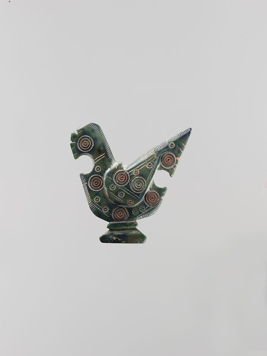 This charming object was designed to hold kohl, a black cosmetic powder applied around the eyes. In the past, kohl was widely used by men and children as well as women. It was thought not only to accentuate the beauty of the eyes, but also to guard against the glaring sun, ward off evil, and discourage eye disease. The narrow drill hole at the top of this flask would have accommodated a slender stick to collect the cosmetic.
