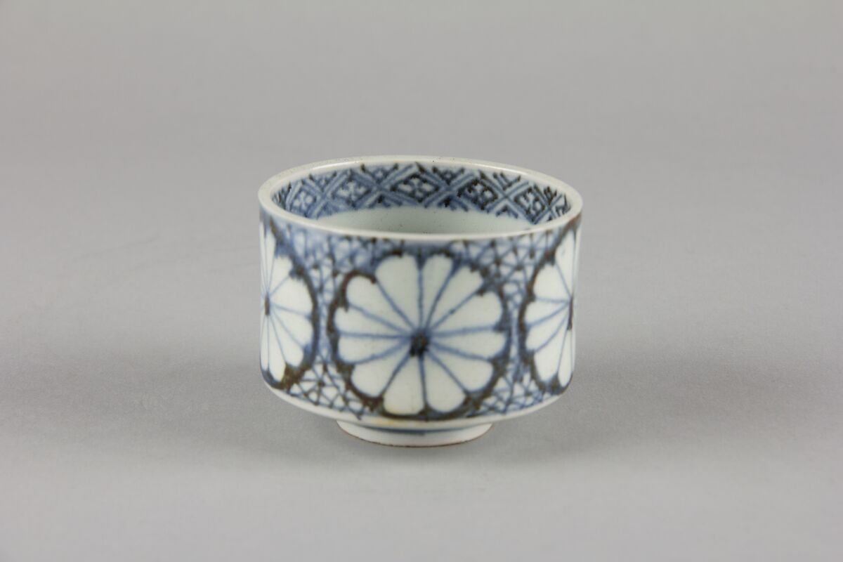 Bowl-shaped vessels known as yunomi-wan were typically used for enjoying tea in everyday life. Despite their resemblance to soba cups, bowls of this type—with straight, tubular walls, wide mouths, and narrow, deeply recessed foot rings, a form known as hanzutsu-gata, meaning “half-cylinder” or “semi-tubular”—were likewise crafted for tea consumption. Their interiors are often adorned with five-petaled floral motifs, while a patterned band encircles the inner rim.