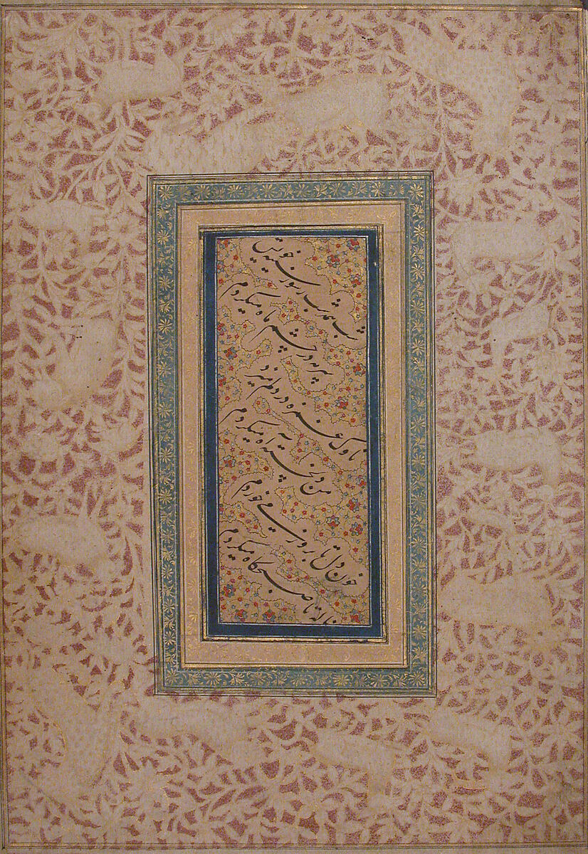Six lines of Persian poetry in nasta’liq appear in the central panel. The borders of this folio are executed with stenciling and marbling, through which figures of seated animals appear against a speckled ground.