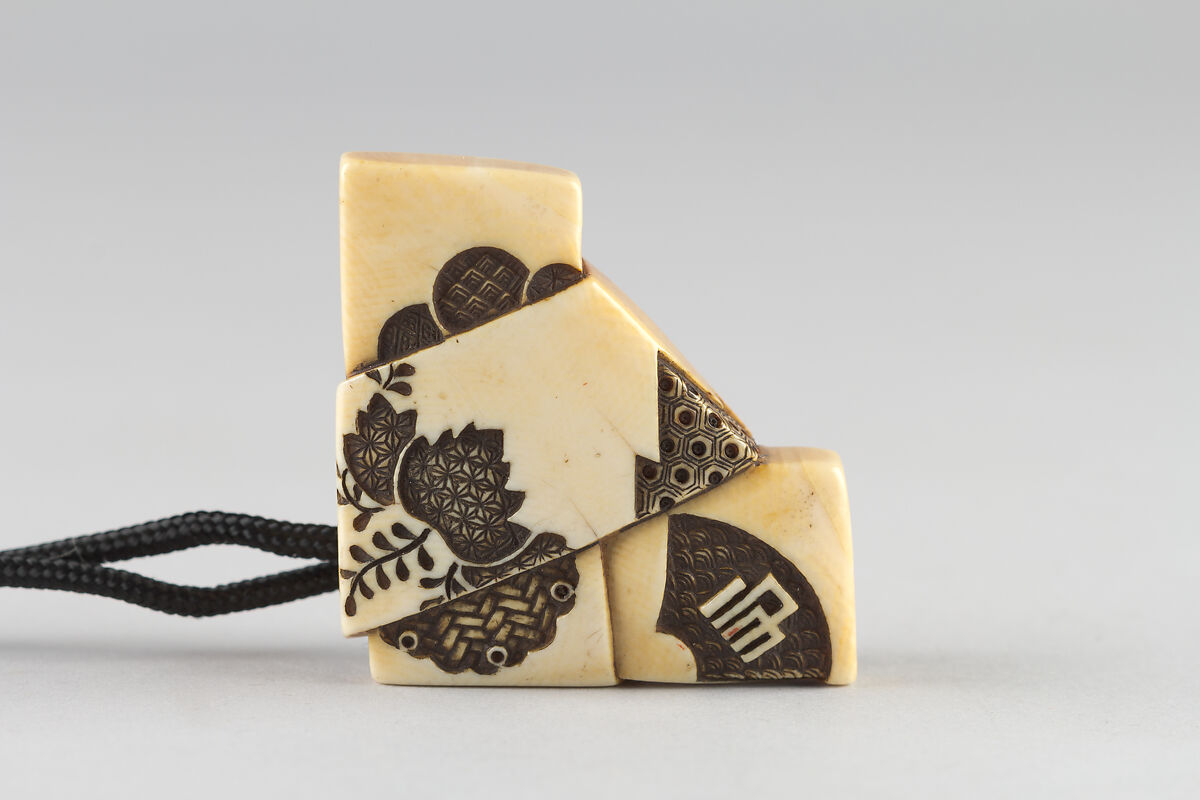 - Title: Netsuke Carved in Shape of Folded Letter on Paper Decorated with Court Motifs