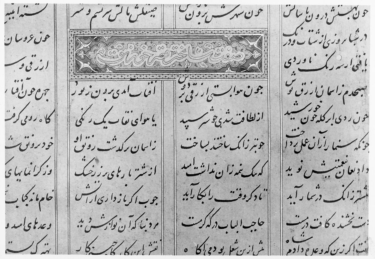 The manuscript of the Haft Paikar (Seven Portraits) was copied by Azhar, a pupil of Ja'far, in a fine nasta'liq that resembles that of his master. The volume opens with an illuminated shamsa, followed by a double-page illuminated frontispiece. Small illuminated panels bearing captions are found throughout the text, all in a style close to the illumination of Laila u Majnun (1994.232) but not quite so fine in the quality of drawing or clarity of pigment. The lacquer binding was added in India.