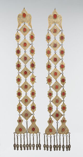 - Medium: Silver, fire-gilded and chased, with wire chains, embossed pendants, and table-cut carnelians; probably missing connecting chain