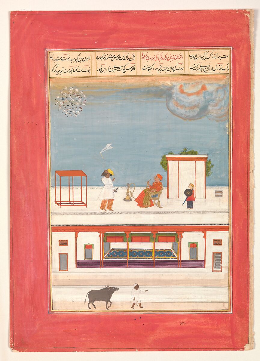 - Title: "A Raja Seated on a Palace Rooftop Smoking a Huqqa", Folio from a manuscript of the Raga Darshan of Anup