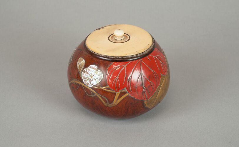 - Medium: Roiro (waxen) lacquer with sprinkled hiramakie lacquer, tsuishu red lacquer relief, and coral, blue glass, shell, ivory, and metal inlay; Interior: fundame; Ojime: gold metal bead with enamel floral decoration; Netsuke: carved wood chrysanthemums