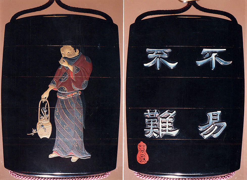 - Title: Case (Inrō) with Design of Young Woman with Flower Basket of Plum Blossoms (obverse); Four Large Characters (reverse)