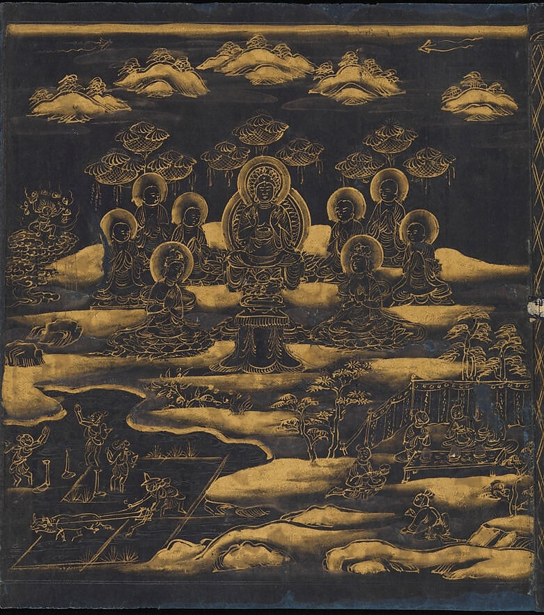 This sutra once formed part of a much larger set of handscrolls depicting all twenty-eight chapters of the Lotus Sutra, among the most popular Buddhist scriptures. Each scroll consists of a pictorial frontispiece (at far right) followed by a section of text, both brushed in gold paint on indigo-dyed paper. The handscroll on view contains a portion of the Lotus Sutra’s fifth chapter, “Parable of the Medicinal Herbs.”