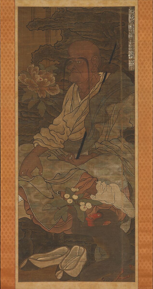 According to Buddhist scripture, arhats (Japanese: rakan) are protectors of the Dharma who also use assorted magical powers to assist the faithful. They were frequently depicted in groups of eight, sixteen, eighteen, twenty-eight, or five hundred. The arhats pictured were originally part of a group of sixteen (of which only seven are extant) once owned by Hokokuji, a temple on the island of Shikoku. Each arhat in the set is identified by a cartouche at the upper right or left.