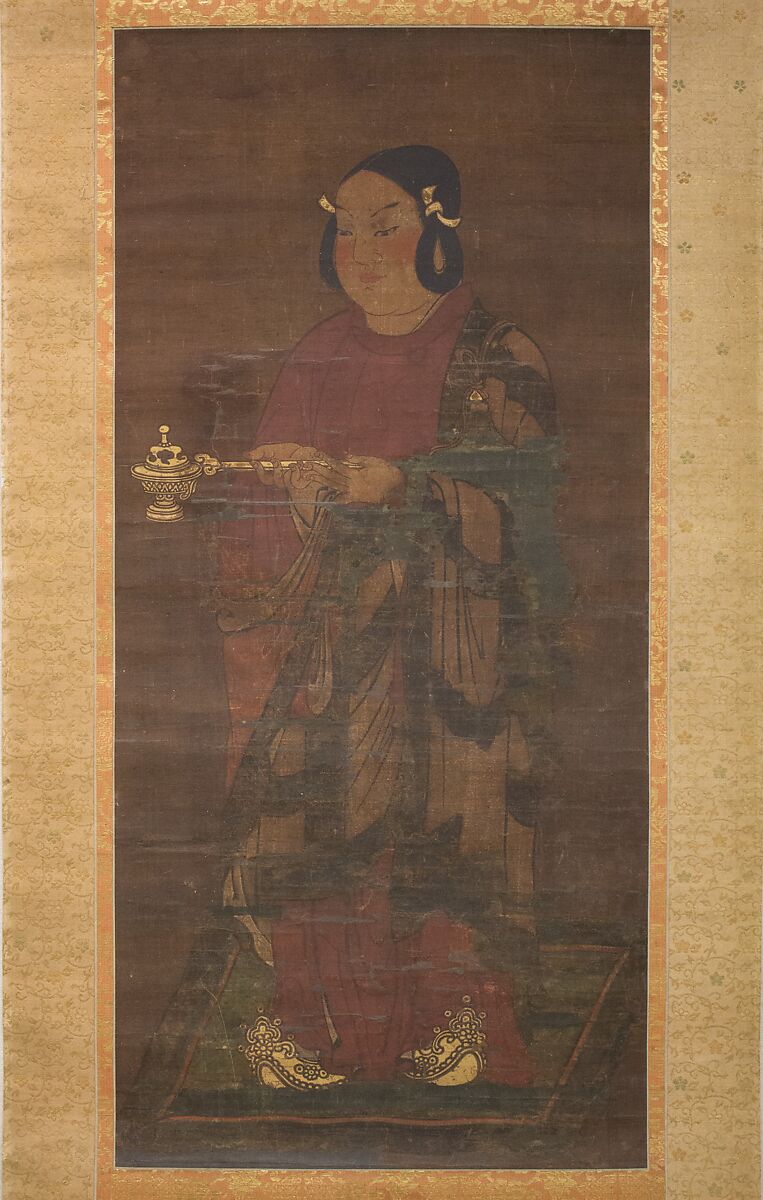 Imaginary portraits and legends about the life of Prince Shōtoku (574–622), the foremost proponent of Buddhism in Japan, emerged soon after his death. Based on the prince’s mid-Heian-period biography, this painting portrays him in a form in which he was often revered as a deified historical figure: at the age of sixteen, he prayed for his father, Emperor Yōmei (518–587), to recover from illness. The pose, which belongs to a category of portraiture known as kōyō-zō (images of filial piety), appears in both paintings and sculptures of young Shōtoku, which make up nearly half his extant portraits. Dressed in a monk’s robe, he holds a censer; his hair is arranged in the two loops of a youth and frames boyish, idealized features.