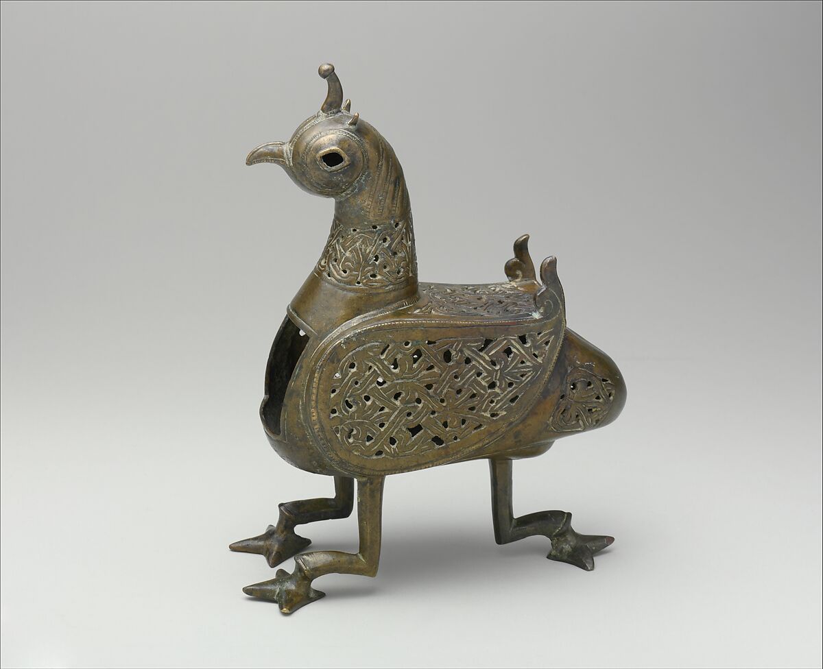 Incense was widely used in the medieval Islamic world. At receptions and special events servants would waft the guests with the aromatic smoke emanating from the openwork of the incense burner and sprinkle them with drops of scented water. This bird-shaped incense burner represents a class of metalwork that would have been sold at market. Birds figure prominently in the decorative repertoire of the Seljuq period, and were probably associated with good fortune.
