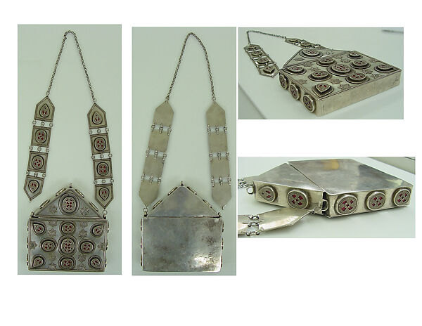 - Medium: Silver; with stamped beading, glass inlays over red lacquer, paper, or fabric backing, and chains