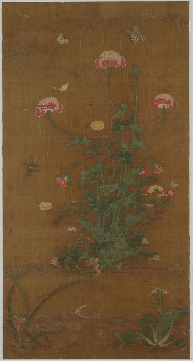 This decorative work of the Piling school of flower painting compares closely to signed works by the late-fourteenth-century painter Lü Jingfu. Originally one of a matching pair of panels, the painting shows butterflies and a praying mantis flying amid a late-spring bouquet of poppies, asters, Chinese pinks, and chrysanthemums; a salamander in the center foreground is flanked by an orchid on the left and a cabbage on the right. The flowers and insects are flawlessly executed in fine precise brushwork and colored in delicate hues of pink, white, green, and purple, with malachite green and powder-white highlights.