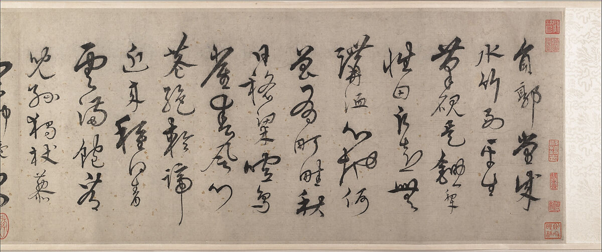 A lover of martial arts as well as an accomplished poet, Song Ke briefly pursued a military career before returning to his native Suzhou, where he lived in retirement from about 1356 until the first Ming emperor (r. 1368–98) summoned him to serve as calligrapher-in-waiting at court. The foremost calligrapher of the early Ming, Song Ke based both his cursive and his regular scripts on those of Zhao Mengfu (1254–1322). This scroll probably dates to near the end of the Yuan dynasty (1279–1368). It is executed in sharp, incisive thrusts and powerful curves that evoke Song's martial spirit, and its mixture of cursive and draft-cursive styles recalls the writing of two of Zhao Mengfu's early followers: Kangli Naonao (1295–1345) and Rao Jie (ca. 1300–1367).