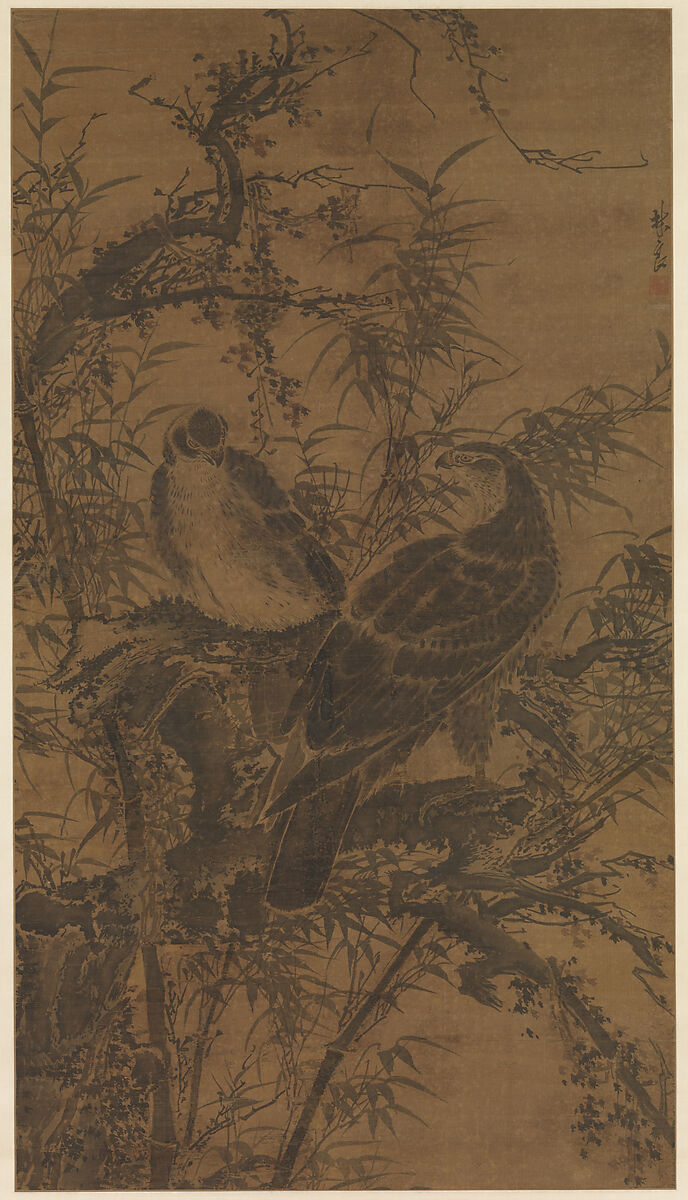 Never before had there been such hawks as those painted by Lin Liang. Standing like monuments to strength and courage on the highest frozen peaks swept by bitter winds, living in worlds that lesser creatures could not inhabit, Lin's great birds are embodiments of heroism. In contrast to his usual image of hawks silhouetted against the sky and surveying their surroundings from a high perch, however, these noble birds appear withdrawn and reclusive, inviolable and inaccessible, as if lost in a dense forest of old trees and thick bamboo where no one could possibly reach them.