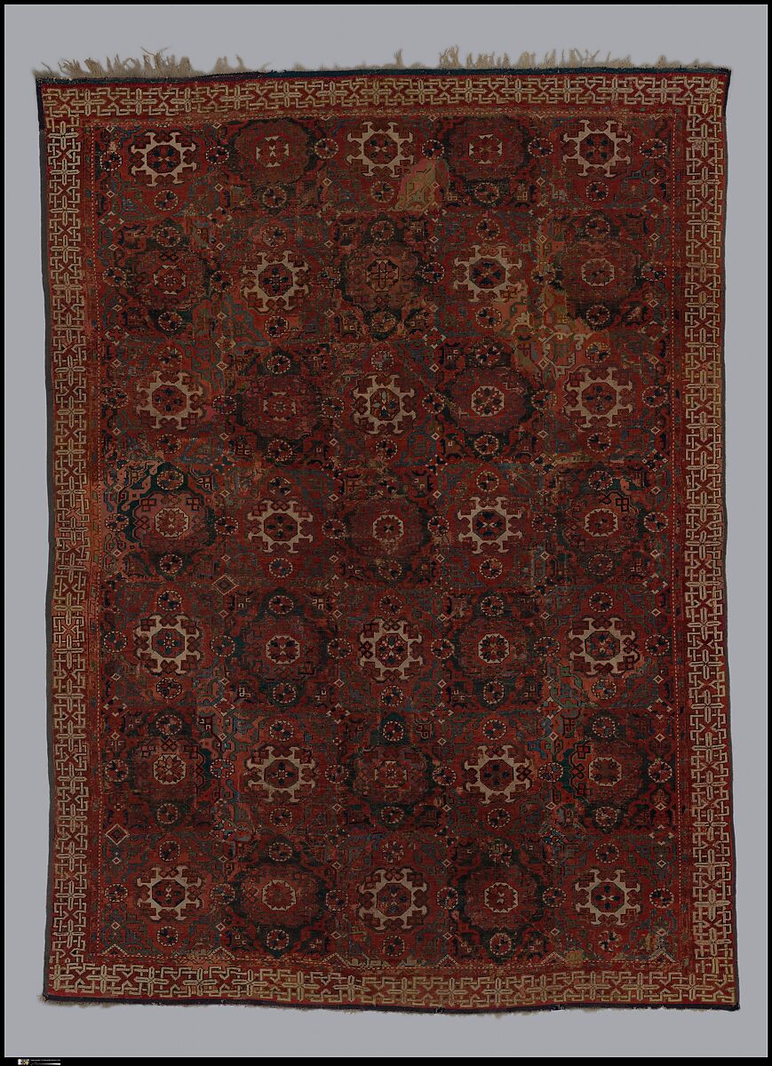Named after a famous portrait by Hans Holbein the Younger that depicts a similar carpet draped over a table, the pattern of this early Turkish carpet is one of the most fundamental of all carpet designs. Many other carpet patterns are derived from its arrangement of small knotlike medallions and diamond-shaped strapwork. Its interlaced border is related to the kufic border found in many early 'Lotto' carpets. "Holbein" carpets were woven in Anatolia as early as the fourteenth century, and became popular in Europe from the fifteenth century onward.