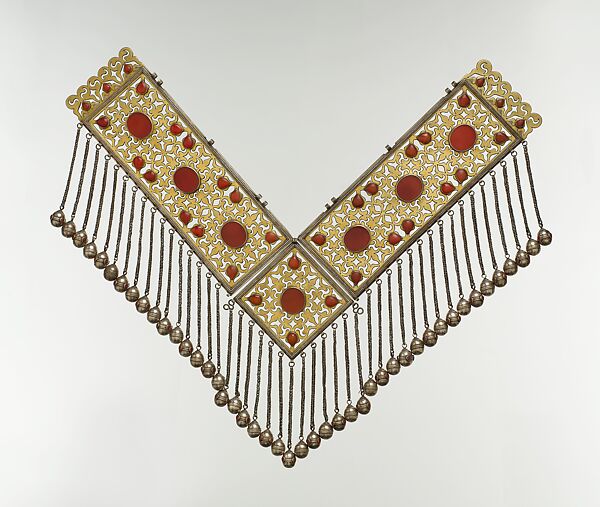 - Medium: Silver, fire gilded with openwork, decorative wire, twisted wire chains, bells, and cabochon and table cut carnelians