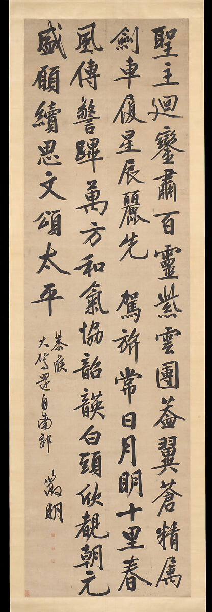 From 1523 to 1527 Wen Zhengming served as an official in the capital, where his talents—as well as his patience—were put to the test by a flood of requests for literary compositions and calligraphy. This poem, written in celebration of the Jiaqing emperor's (r. 1522–66) return journey to his palace, is lavish in praise and formal in tone; the calligraphy is in the grand manner of Yan Zhenqing (709–785) and Huang Tingjian (1045–1105):