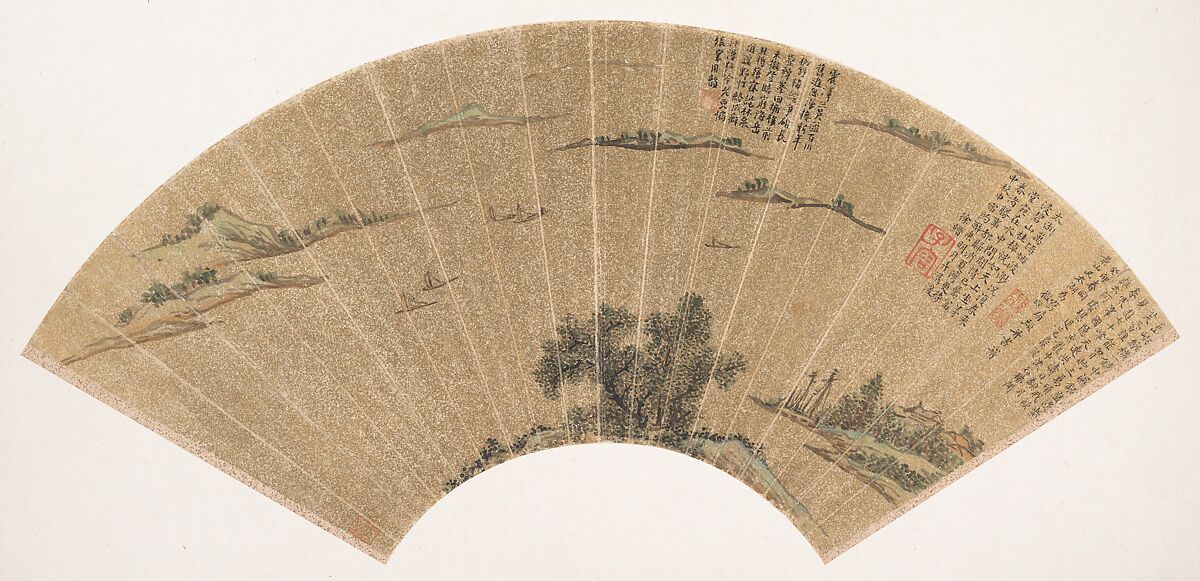 - Medium: Folding fan mounted as an album leaf; ink and color on gold-flecked paper