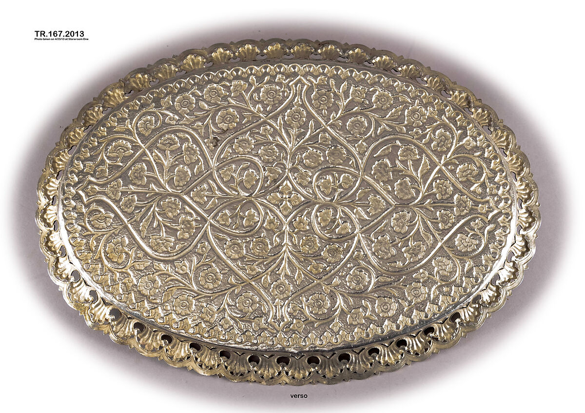 This tray shows European influence in its oval shape (Indian trays generally being of round shape), while the decorative leafy motifs also loosely recall vase-inspired profiles that were popular in paintings, textiles, and carvings all over the region. The nature of the ornament combines a long standing taste in the Deccan for arabesque-based decoration, with a balance and symmetry that indicate Mughal taste.