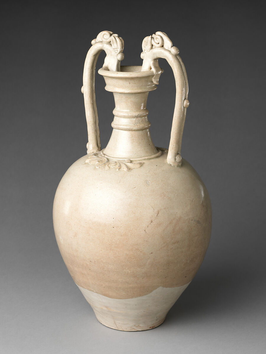 This wine container reflects the cosmopolitanism of Chinese art in the seventh and eighth centuries. Its ovoid body and tall neck recall the shape of Greco-Roman amphoras made in the eastern Mediterranean, while its animal-headed handles allude to versions in Persian and Central Asian metalwork. But the fine buff glaze of its stoneware is distinctively local, and the handles’ animal heads have turned into Chinese dragons.