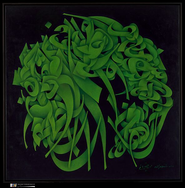 An Iranian master calligrapher of the nasta'liq script, Mohammad Ehsaey has penned countless manuscripts of the Qur'an, anthologies by Iran's most celebrated poets, and album pages. He is also known for his calligraphic compositions called naqqashi-khatt, which are often large-scale compositions in oil on canvas but sometimes take the form of calligraphic sculpture. Ruyesh, which takes its title from the Persian word meaning "evolution," alludes to an earlier body of work by the artist characterized by its density, symmetry, balance, and definition of form. This composition, in contrast, is irregular, consisting of large interwoven letters in nasta'liq script in bright, grassy green with soft black outlines on a cloudy black ground. According to the artist, "the letters are recognizable but not poetic verses. They are not meant to be read but appreciated for their aesthetic attributes." Here, form supersedes content, and the shapes of the letters and their placement within the composition are given prominence. The circle is irregular and asymmetrical, and there are fewer, more loosely woven letters. Perhaps an expression of the artist's unease with the world around him, Ruyesh nonetheless presents a glimmer of hope, conveyed through the liveliness and the vibrant green hue of the letters.