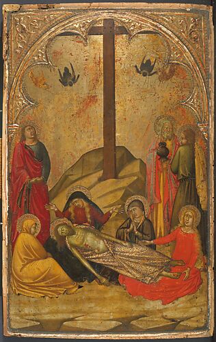 Niccolò di Buonaccorso was one of the most accomplished Sienese painters of the second half of the fourteenth century, though he is little known today. His surviving works are small in scale and rendered in a highly refined miniaturist technique. This richly decorated "Coronation of the Virgin" corresponds in style, size, and framing to two other panels also depicting scenes from the Life of the Virgin: The Presentation of the Virgin (Uffizi, Florence), the Marriage of the Virgin (National Gallery, London). The backs of all three panels are decorated with the same ornamental pattern, suggesting that the structure originally folded in a fashion that would have allowed the backs to be seen. It is not clear how or if the panels were originally joined. Like the other two panels, this one is silvered, punched, and painted with a pattern of diamond-shaped lozenges in blue and red on the verso; the outer edges were originally silvered and punched. It has been suggested that the polyptych may have been produced for the Spedale of Santa Maria Nuova in Florence.