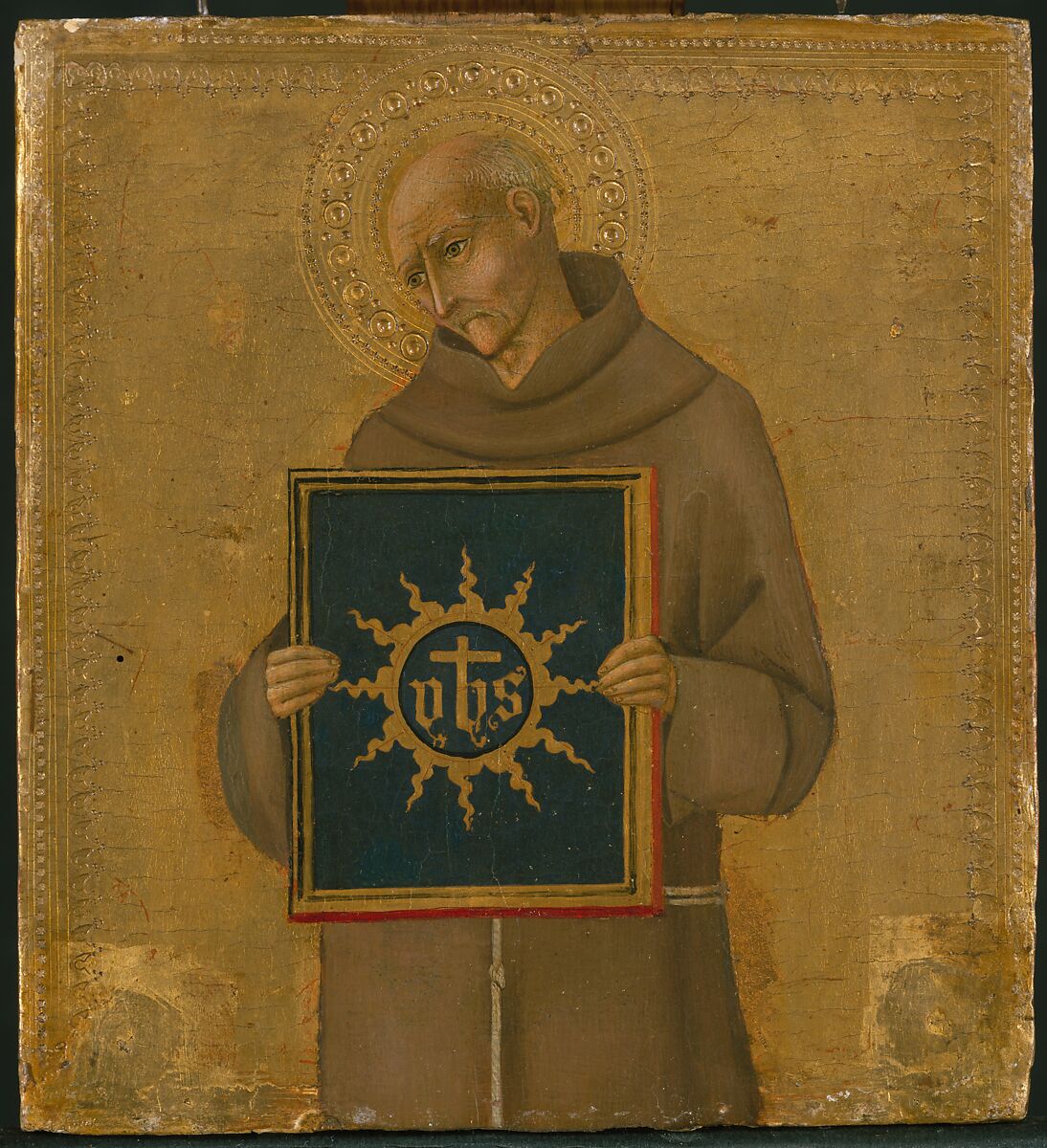 San Bernardino, an important fifteenth-century Franciscan preacher, is portrayed wearing the habit of his order while holding a tablet inscribed with the sacred mongram YHS. This panel and another in the Lehman Collection, which depicts a similar figure of Saint Francis (1975.1.50), originally belonged the same (unidentified) altarpiece complex, and likely appeared at the base of the pilasters. The two Lehman panels resemble the pilaster panels of the triptych painted by Sano di Pietro in the Basilica of San Bernardino all’Osservanza in Siena.
