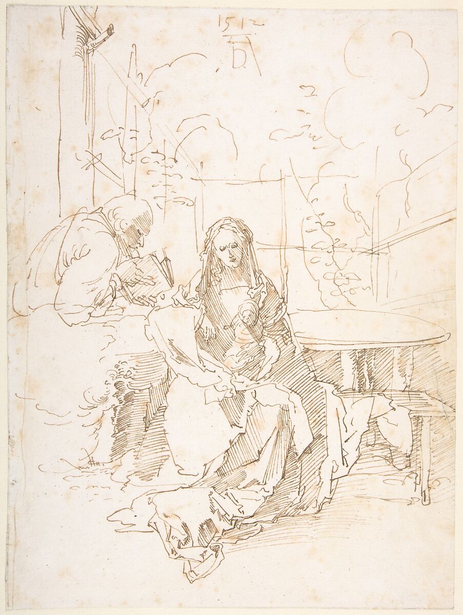 This drawing is a variation on a popular fifteenth-century theme in which the Madonna is portrayed seated in a rose garden or on a grassy bank. The arbor suggests the enclosed garden, or hortus conclusus, a visual metaphor for Mary’s virginity. Durer’s working technique - lightly sketched outlines, areas of parallel hatching to differentiate light and shadow, and little attempt at three-dimensionality - exemplifies his graphic production during the second decade of the fifteenth century.