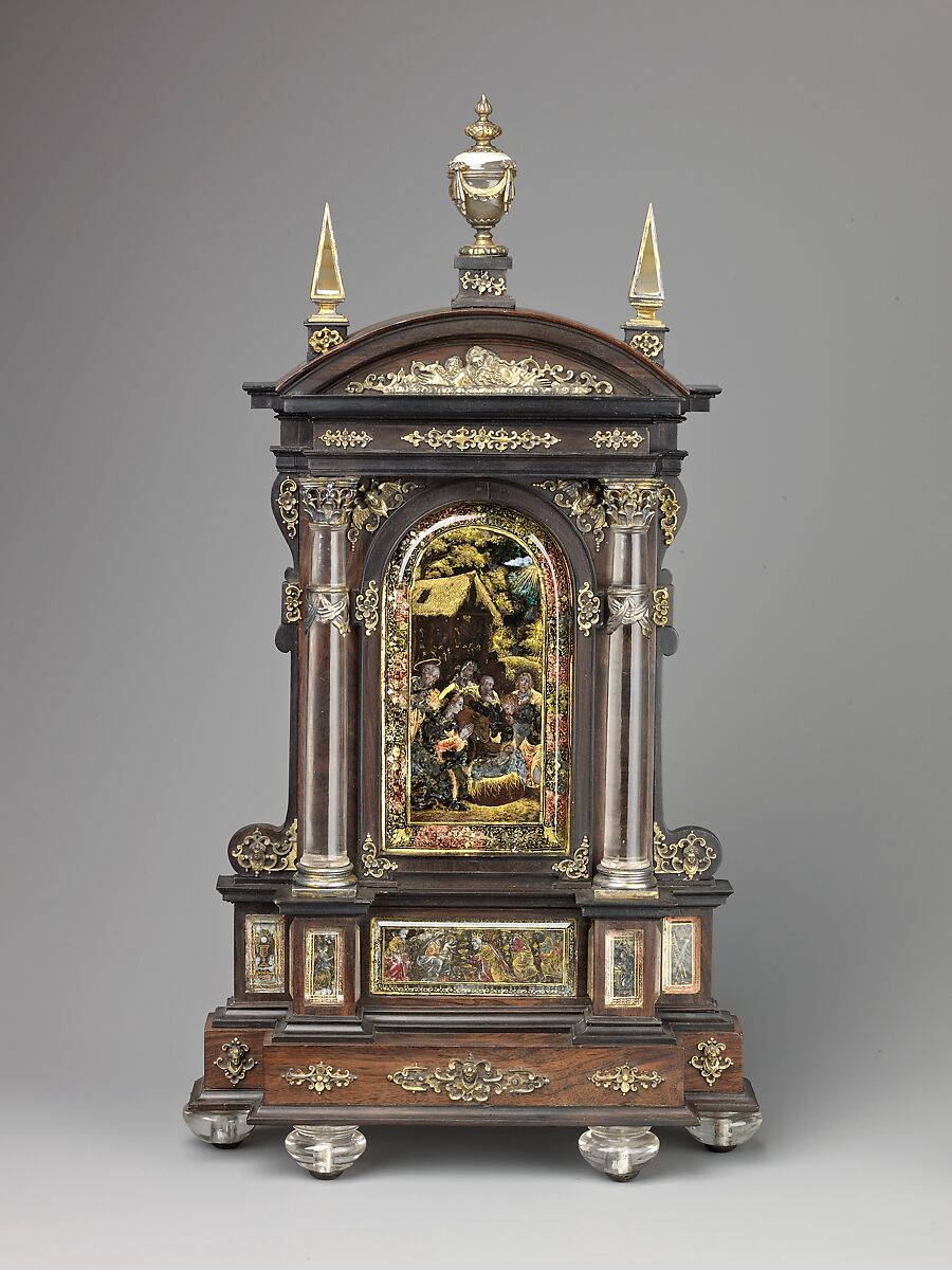 - Medium: Ebony-veneered soft wood, silver gilt, rock crystal, agate, and reverse painted and gilded glass.