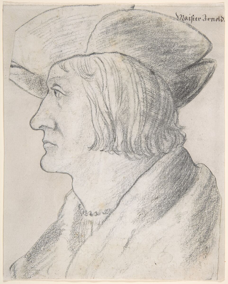 This sensitive portrait is one of a series of some 168 drawings said to have been owned by the patrician Pfinzing family of Nurnberg. Originally attributed to Albrecht Durer, they were correctly reassigned to the celebrated German medalist Hans Schwarz in the late nineteenth century following the discovery of his fragmentary monogram on a drawing’s verso. Schwarz’s oeuvre includes remarkable profile portraits of the burghers of the early German Renaissance, as imposing in quality as the imagery on antique coins. The Lehman drawing was preliminary to the carving of a portrait medal of Simon von Liebenstein, a canon of the cathedral in Speyer. The annotation “Maister Arnold” refers to a much later inscription relating to the sheet’s misattribution to Albrecht Durer.