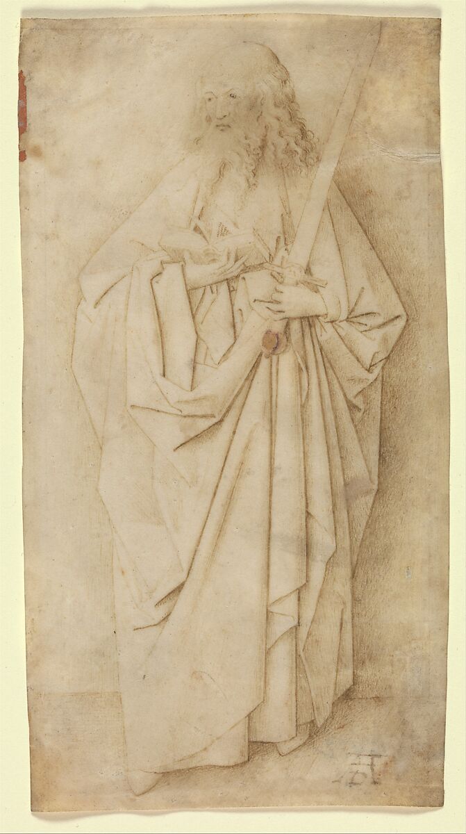 Once attributed to Petrus Christus (1410-1472/73), this drawing on vellum has since been reassigned to an artist in the Circle of Jan van Eyck. It is one of two extant drawings in a series of the twelve Apostles. The vellum is so transparent that it is conceivable that the straight pen lines defining the contours and folds of the drapery were traced from a model and the hatching filled in afterward with point of brush. It is likely that the Lehman drawing and its prototype related to a painting, possibly a grisaille painting, rather than to sculpture.