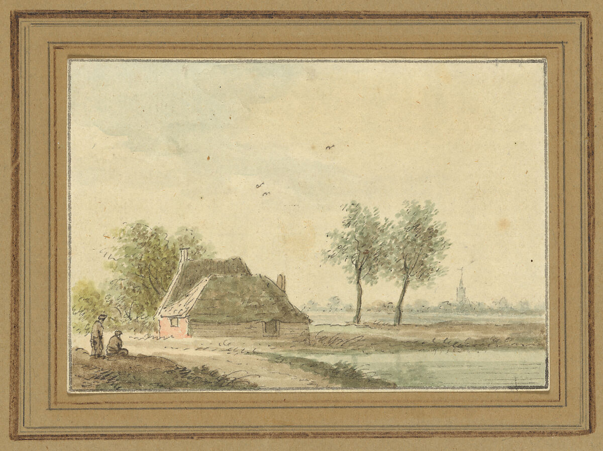 - Medium: Pen and grayish brown ink, brush and washes in blue, green, grayish brown and pink; original framing line in gray.