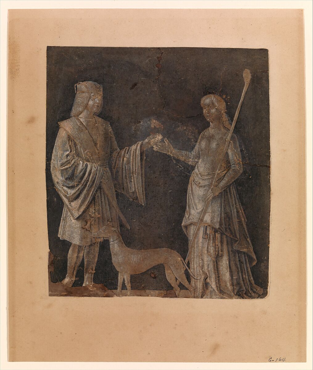 The meaning of the scene is mysterious, and its interpretation is made more difficult by damage at the point where the hands of the man and woman meet to exchange an object. She is apparently a gardener—the long tool she holds was used for digging up bulbs—but her relationship to the gentleman is unclear. The drawing may represent an allegorical scene of courtly love, suggested by the dog, a symbol of fidelity. The costume of the male figure is French in style and recalls northern European tapestries and manuscript illuminations.