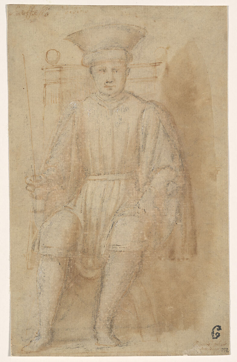 This drawing of an enthroned man holding a scepter may be a portrait of an unidentified ruler, and was perhaps intended for a cycle of illustrious men. In its format, size, and iconography, the drawing recalls popular fifteenth-century tarot cards (tarocchi), and specifically “emperor” cards, which portray similar, closely cropped images of enthroned male figures with attributes of rulership. Formerly associated with Piero della Francesco, the drawing was produced by a less-talented follower.