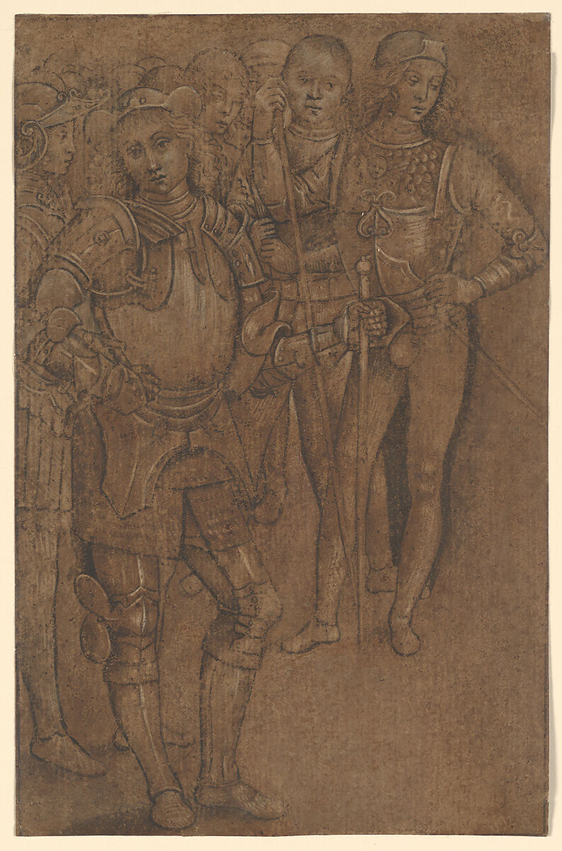The composition of this drawing, depicting a group of standing soldiers, exists in several other versions by different hands, which may all derive from a lost original prototype. Similar figures are found in works by Pinturicchio and Perugino and may have been stock types that circulated in the studios of Umbrian artists, which were adapted for various types of subjects.