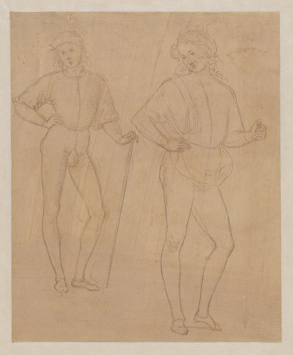 The differences between the two figures, in terms of pose, gesture, clothing, and hair, probably reveal a common artistic practice by which the artist began by drawing the live model and, on the same sheet, experimented with variations that would be adaptable to a particular project.