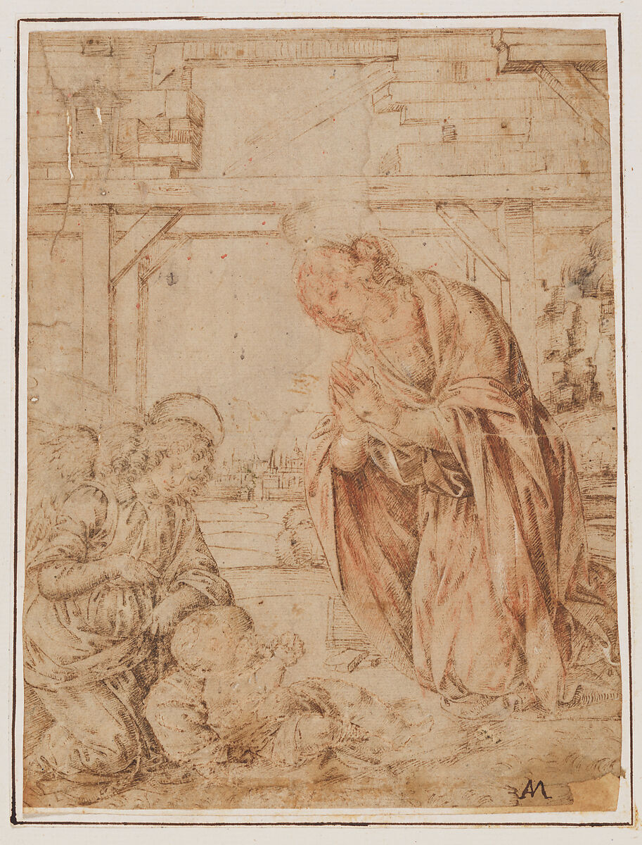 Similar compositions frequently appear in painted roundels (tondi) attributed to Lorenzo di Credi and his circle, including an example in the Metropolitan Museum (09.197), which differs in its inclusion of Saint John the Baptist. It is uncertain whether this drawing was a preparatory study for a painting or was derived from a finished work.