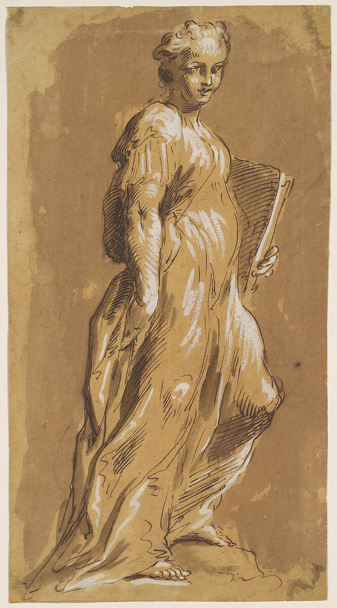 - Medium: Pen and light brown wash, heightened with white, on paper covered with light brown wash