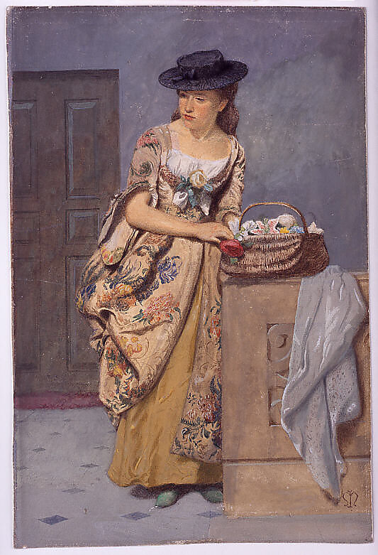 This elegant, carefully rendered watercolor has persistently puzzled scholars, who first associated it with the work of a Franco-Spanish artist but have now come to recognize its nineteenth-century British provenance. The monogram at the bottom right bears some resemblance to that of the English artist John Everett Millais, but as the drawing shares no stylistic similarities with Millais’s work, it seems more likely that the monogram was added later, either in error or as a deliberate deception.