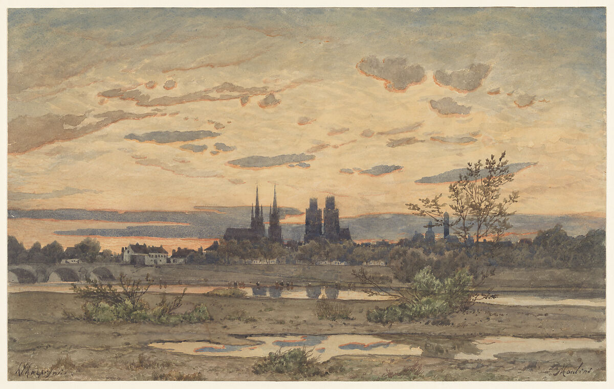 This characteristically placid watercolor by Henri- Joseph Harpignies captures the skyline of Moulins at sunset. The capital of the department of Allier, Moulins is roughly one hundred miles northwest of Lyon in France. The highly finished nature of this landscape, together with its signature at the lower right, suggests that Harpignies may have marketed it as an independent work of art.