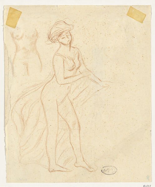- Medium: Brown conté crayon on polished, buff, wove paper, left edge torn as if from a sketchbook