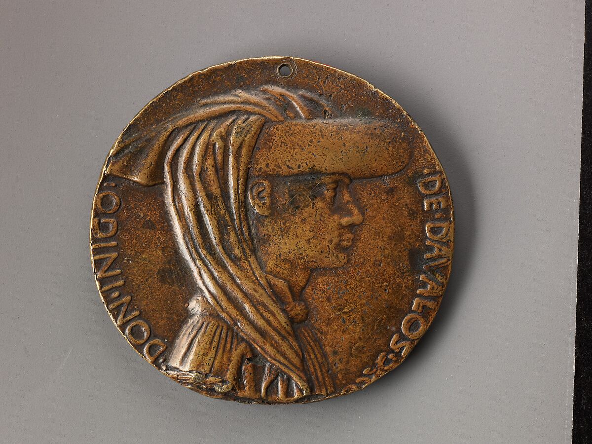 Active in Verona and the Italian courts, the celebrated master Pisanello left behind a significant legacy, including a large corpus of drawings, several paintings, and the devopment of the Renaissance portrait medal. Inspired by Roman coins, with their portraits of rulers and allegorical representations on the reverse, the medals commemorated individuals or events and functioned as gifts and mementoes. Pisanello’s medal of Don Inigo d'Avalos, grand chamberlain and military general to Alfonso V of Naples, depicts the sitter wearing a fur-trimmed robe and a hat composed of a rolled hood (cappuccio) and long draped portion. The image on the reverse – a spherical earth with the sea and starry sky -- may have been inspired by Homer’s description of the shield of Achilles in the ancient Greek poem, the Iliad. This interpretation would celebrate d’Avalos’ military prowess; however, the image may also have astrological or biblical significance, alluding to the creation of the world or the influence of the stars. Above, flanked by two blossoming rose branches is a shield with a triple-towered castle, the arms of Avalos. This old aftercast has much wear, and the lower edge is missing.