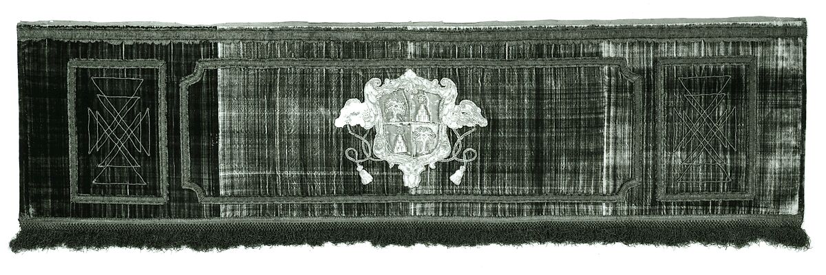 - Medium: Red silk cut velvet appliqued with linen and silk rep weave outlined with couched gilt and cotton cording ending in tassels.