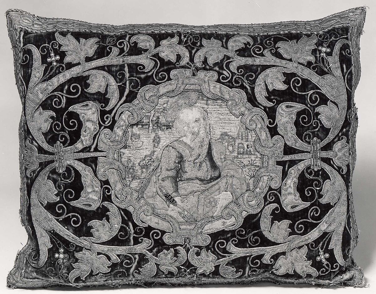 This apparel and another in the Lehman Collection (1975.1.1894), from the front and back of a dalmatic (a liturgical vestment), have been backed with a modern silk fabric and finished as cushions. The embroidered designs were worked separately and then appliquéd to dark red silk cut velvet. On each apparel a center medallion framed by strapwork depicts a saint in three-quarter view. Both saints hold books, and one holds a bow and arrow, the other a standard with two banners. The compositions are completed with more foliate strapwork and scrollwork (in mirror image based on a center axis) embellished with couched gilt cording highlighted with silvered thread cording.